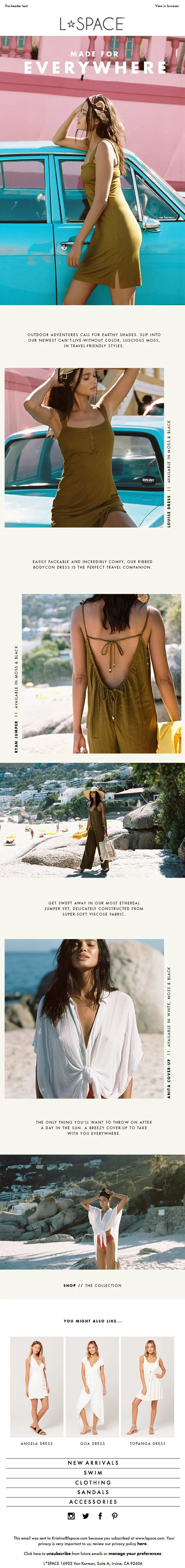 Drafted copy for L*SPACE’s seasonal print catalog. I crafted headlines and succinct product stories designed to engage readers, ensuring the brand’s voice translated seamlessly from its website to the page.